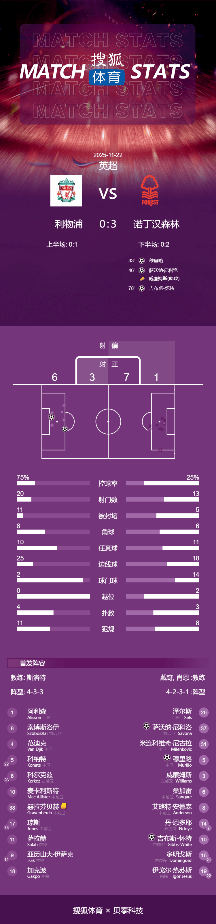 北京时间11月22日23时,2025-26赛季英超联赛第12轮继续进行,坐镇安菲尔德球场的利物浦0-3负于诺丁汉森林,遭遇两连败。本场比赛过后,作为英超卫冕的利物浦,在过去7轮联赛中输掉了6场比赛,在英超积分榜上从榜首位置一路跌至下半区。穆里略第33分钟利用角球机会先拔头筹,萨沃纳下半场闪击扩大领先优势,怀特第78分钟锁定比分。此外,热苏斯还有一个进球被吹。