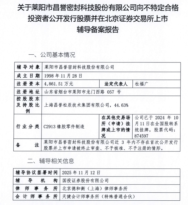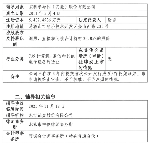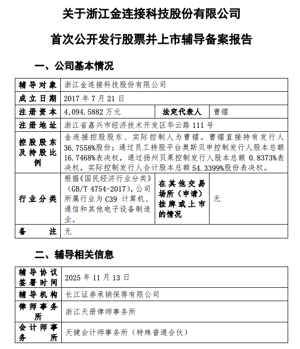 11月23日,证监会网站显示,浙江金连接科技股份有限公司、深圳市维度科技股份有限公司、东科半导体(安徽)股份有限公司、莱阳市昌誉密封科技股份有限公司已启动A股IPO辅导。