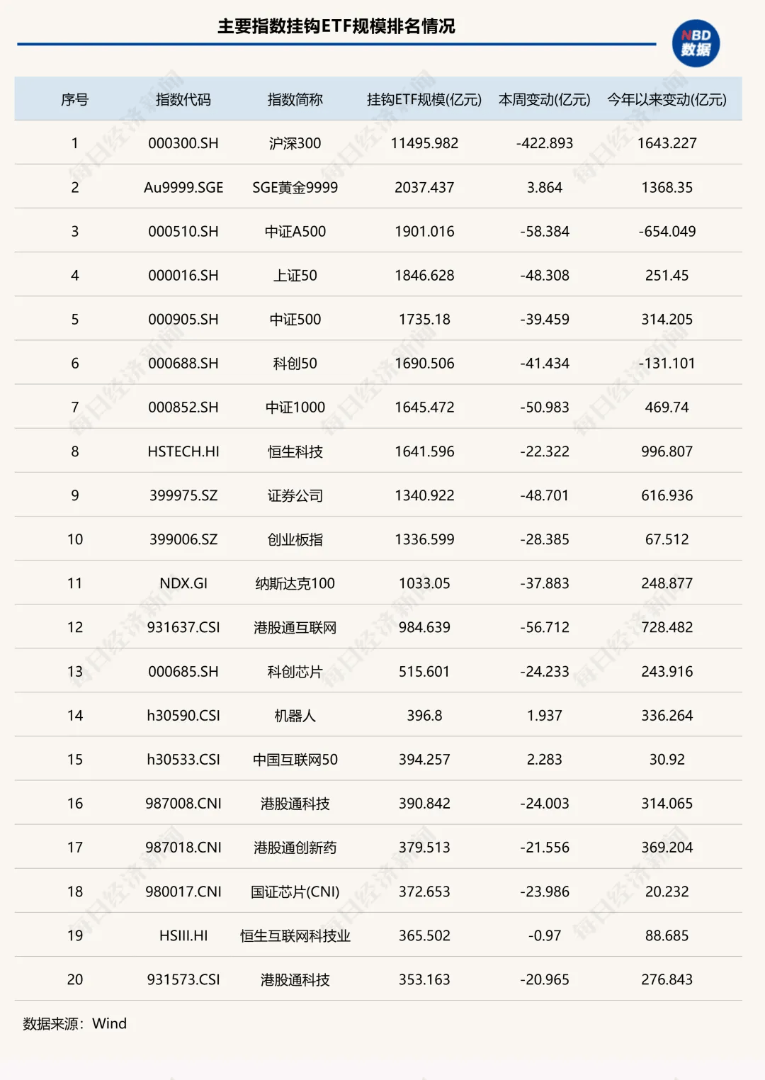 截至11月22日,沪深300指数挂钩ETF规模本周缩水422.89亿元至11495.98亿元,贡献了股票型ETF超36%的缩水额;中证A500指数、港股通互联网指数和中证1000指数本周均缩水超50亿元,“失血”也相对较大。