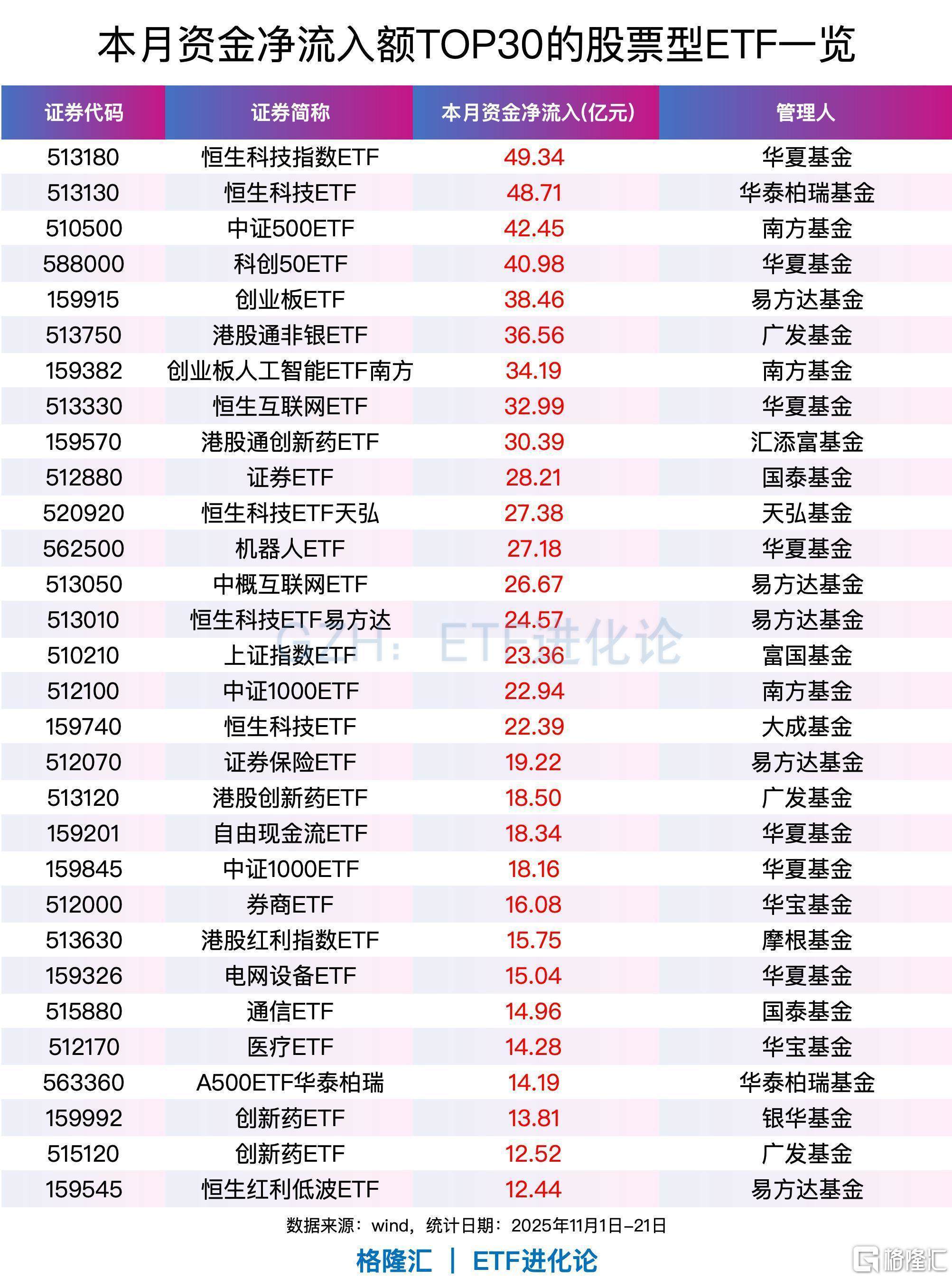 Wind数据显示,港股通非银ETF、证券ETF、证券保险ETF、自由现金流ETF、券商ETF、港股红利指数ETF、电网设备ETF等本月均获超15亿元的资金净流入。