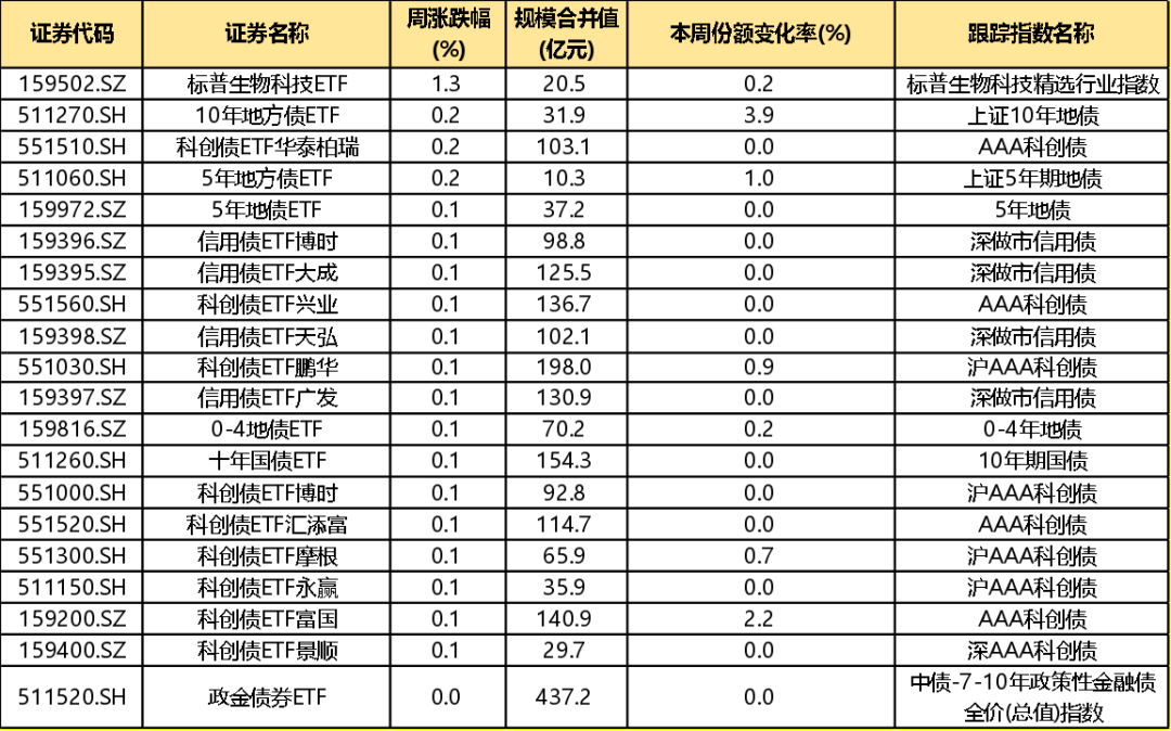 ETF上涨“英雄”榜主要发布当周规模大于5亿元的ETF的涨幅前二十名。