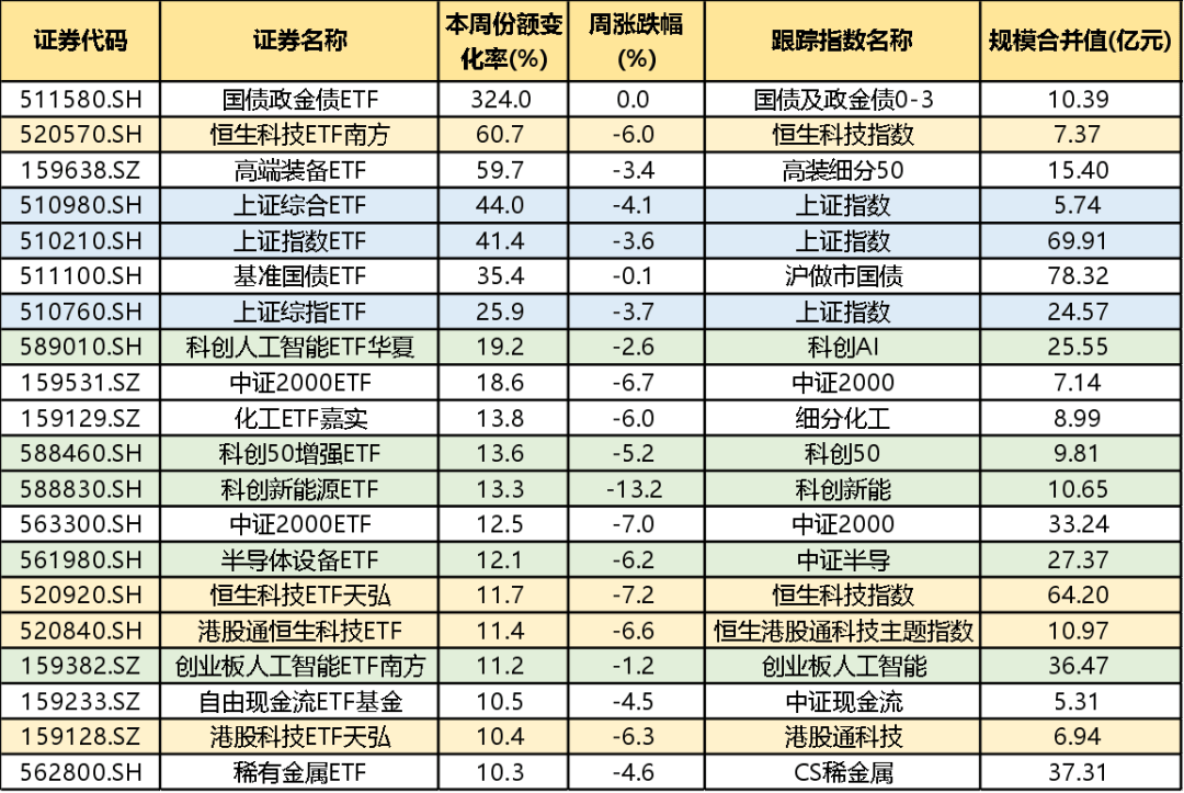 份额增幅榜主要看当周规模超5亿元的ETF份额增加幅度前二十名。