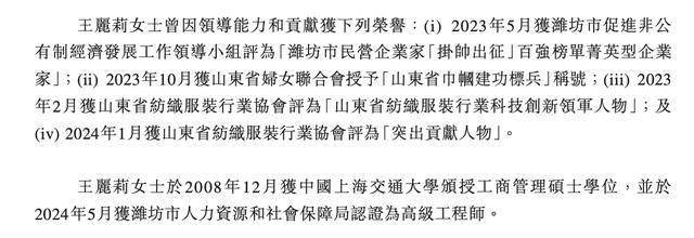 王丽莉于2008年12月获中国上海交通大学颁授工商管理硕士学位,并于2024年5月获潍坊市人力资源和社会保障局认证为高级工程师。
