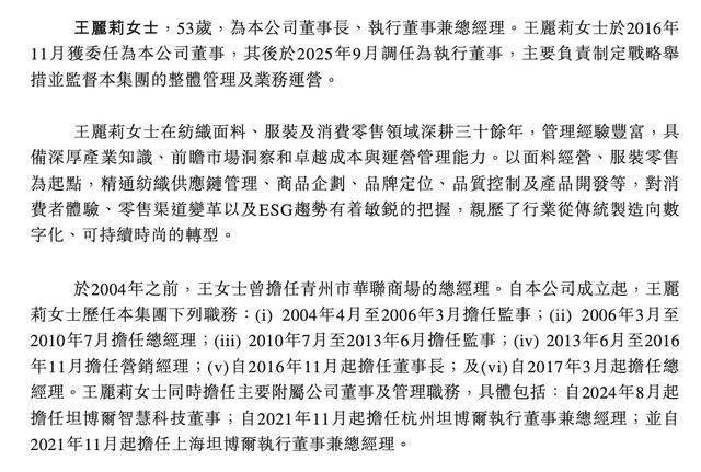 于2004年之前,王丽莉曾担任青州市华联商场的总经理。自公司成立起,王丽莉历任集团下列职务:2004年4月至2006年3月担任监事;2006年3月至2010年7月担任总经理;2010年7月至2013年6月担任监事;2013年6月至2016 年11月担任营销经理;自2016年11月起担任董事长;及自2017年3月起担任总经理。王丽莉同时担任主要附属公司董事及管理职务,具体包括:自2024年8月起担任坦博尔智慧科技董事;自2021年11月起担任杭州坦博尔执行董事兼总经理;并自2021年11月起担任上海坦博尔执行董事兼总经理。