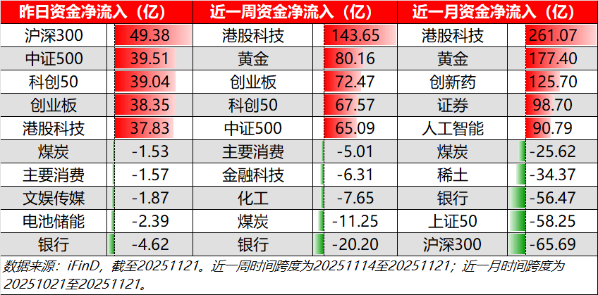 从日、周和月三重维度上看,资金净流入方面,港股科技在三重维度上均呈现资金净流入态势。而中证500、科创50和创业板在日和周维度上资金净流入居前,或显示当前资金对宽基布局的倾向有所增加。