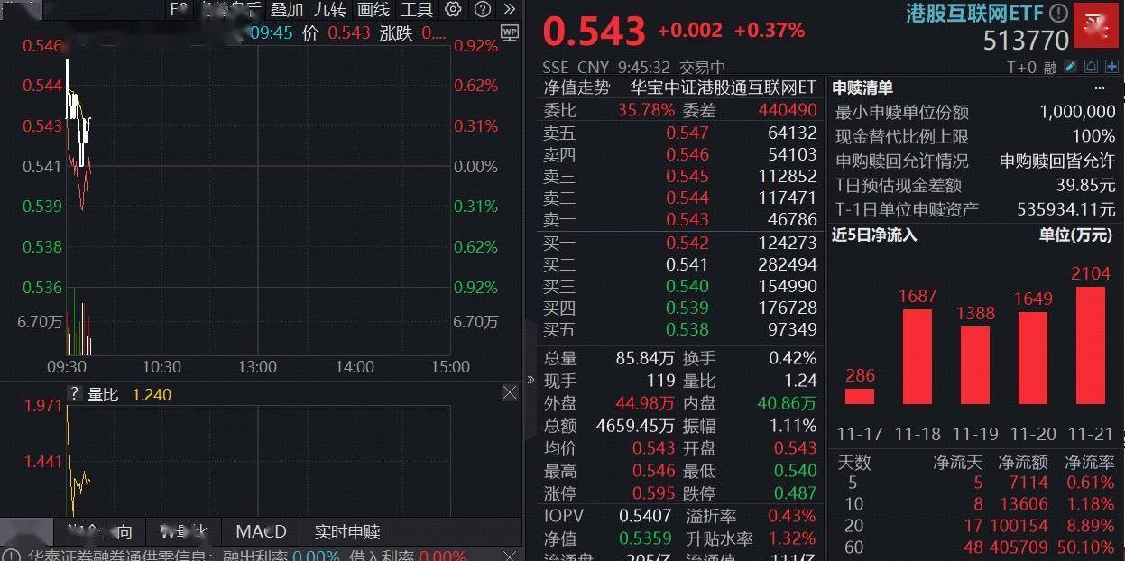 11月24日,港股早盘高开,科网龙头有所回暖,截至发稿,快手-W涨超2%,腾讯控股、小米集团-W、阿里巴巴-W涨逾1%,美团-W跟涨。重仓互联网龙头的港股互联网ETF(513770)红盘震荡,场内价格现涨0.37%,盘中持续宽幅溢价,实时溢价率超0.3%,显示买盘资金积极介入。