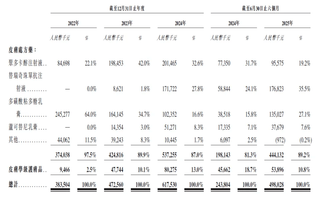 皮肤处方药领域,公司已手握三款上市产品,分别是治疗银屑病的益路取(替瑞奇珠单抗注射液)、治疗浅表性静脉炎的喜辽妥(多磺酸黏多糖乳膏),以及治疗静脉曲张的安束喜(聚多卡醇注射液),另有四款产品处于临床研发阶段。