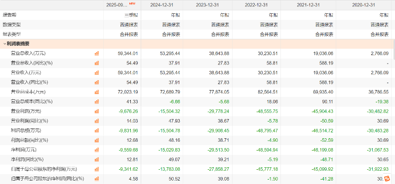 2020年至2024年,泽璟制药营业收入分别为2766万元、1.90亿元、3.02亿元、3.86亿元、5.33亿元;亏损金额分别为3.19亿元、4.51亿元、4.57亿元、2.79亿元、1.38亿元。2025年前三季度,泽璟制药营收为5.93亿元,同比增长54.49%;归母净利润-9342万元。