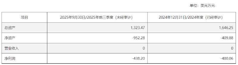 2024年及2025年前三季度,GENSUN的营业收入均为0,同期对应的净利润分别为-480.06万美元、-438.20万美元,截至2025年9月30日,总资产为1323.47万美元,净资产为-952.28万美元。