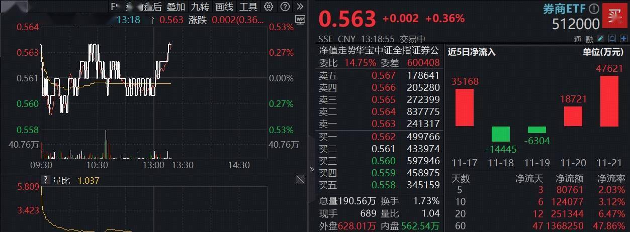 11月24日,券商板块红盘震荡,A股顶流券商ETF(512000)场内价格现涨0.36%。国盛证券涨超3%,华鑫股份、兴业证券涨超2%。此前两日,券商板块随市回调,券商ETF(512000)大举吸金6.63亿元