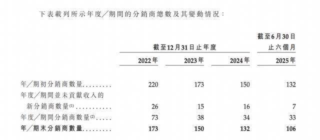 2022年-2024年及2025年上半年,蔓迪国际自分销商产生的收入分别为9.39亿元、11.07亿元、12.67亿元及5.89亿元,分别占相应期间销售产品总收入的96.4%、91.2%、87.9%及80.6%。各期末,其分销商数量分别为173家、150家、130家及106家。