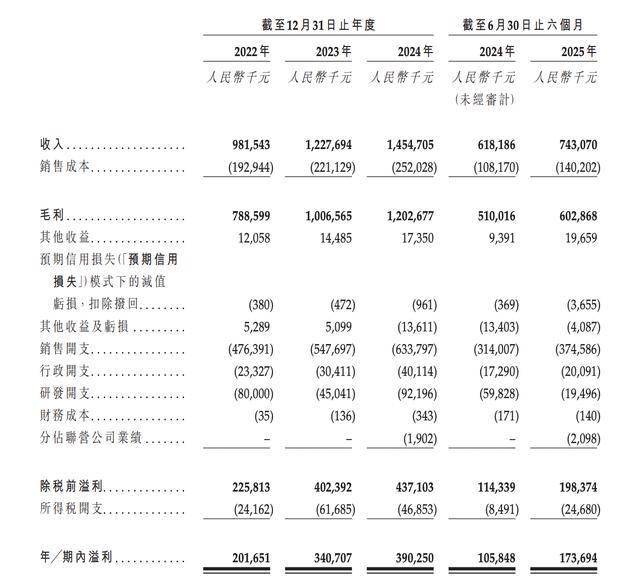 2022年至2024年,蔓迪国际收入分别为9.82亿元、12.28亿元、14.55亿元,年内利润分别为2.02亿元、3.41亿元、3.9亿元;毛利率分别为80.3%、82.0%、82.7%。