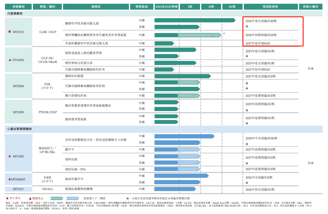 自2007年成立以来,公司专注于代谢性疾病以及心脑血管疾病,并已自主研发一款核心产品MT1013,其主要适应症为继发性甲状旁腺功能亢进,并具备潜力可扩展至慢性肾脏病的矿物质和骨代谢异常伴骨质疏松以及未接受透析的SHPT等额外适应症。