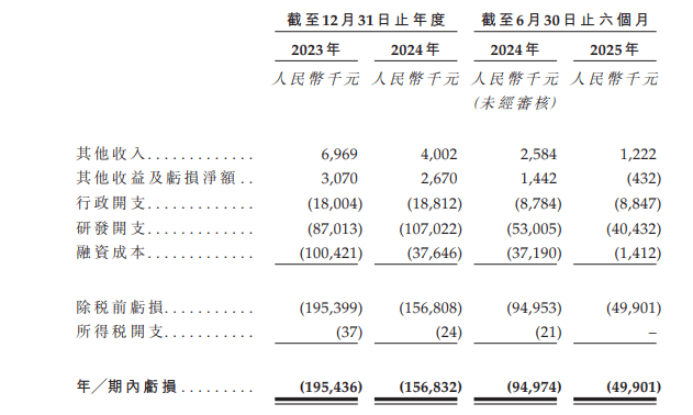 2023年、2024年及2025年上半年(下称“报告期”),公司的其他收入分别为696.9万元、400.2万元及122.2万元;亏损分别为1.95亿元、1.57亿元和4990万元,两年半累计亏损超4亿元。