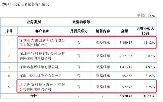 2024年,公司第一大客户为深圳市大疆创新科技有限公司实际控制的公司,销售占总营收比为11.12%。第五大客户为追觅创新科技(苏州)有限公司实际控制的公司。