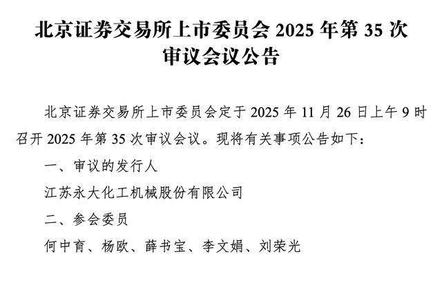 瑞财经 吴文婷 11月24日消息,江苏永大化工机械股份有限公司(以下简称“永大股份”)北交所IPO迎来新进展,将于11月26日上会,保荐机构为国泰海通证券股份有限公司。
