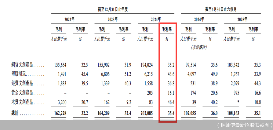 在上述铜价变动期间,毛利率方面,铜师傅铜质文创产品毛利率并不高。2022年至2025年上半年,铜质文创产品毛利率分别为32.5%、31.9%、35.2%、35.3%。以2024年为例,铜质文创产品毛利率(35.2%),不仅明显落后于塑胶潮玩(43.6%)和木质文创产品(46.4%),也低于该年公司整体毛利率(35.4%)。