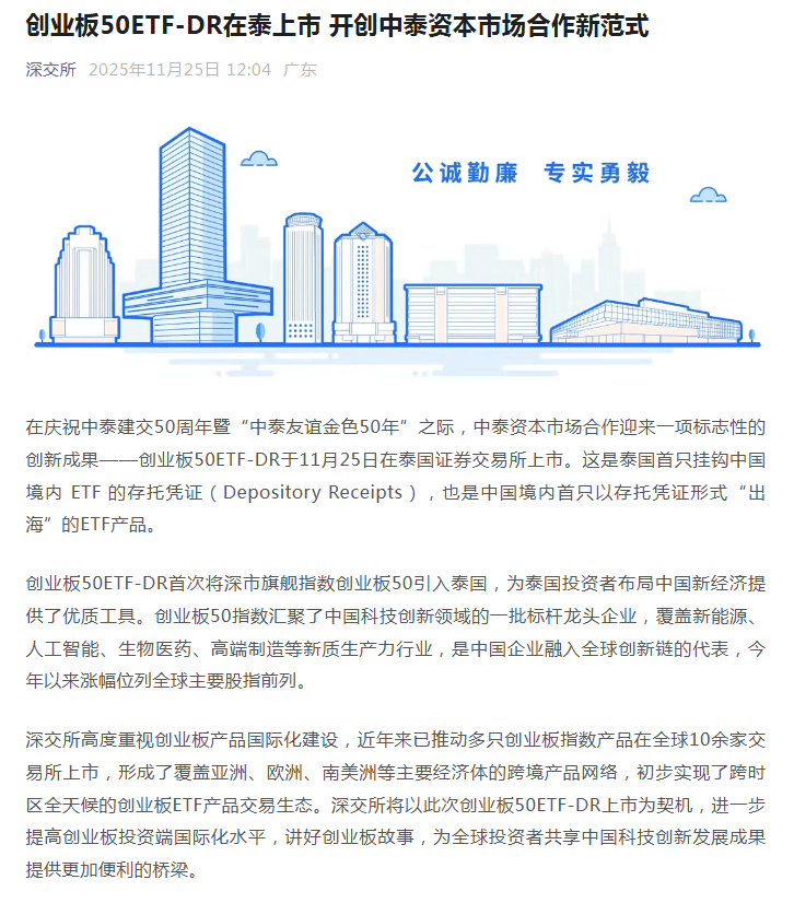11月25日,以景顺长城创业板50ETF为底层资产的存托凭证——创业板50ETF-DR(Depository Receipts,存托凭证)在泰国证券交易所正式上市,为泰国投资者提供投资创业板50指数的上市产品。