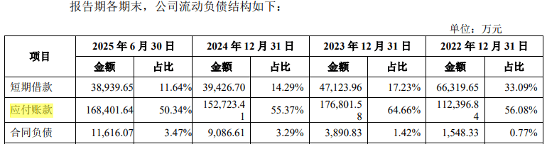 下游客户的应收账款回收周期拉长,盛合晶微来自上游供应商的付款压力也不小。报告期内,公司应付账款分别为11.24亿、17.68亿、15.27亿、16.84亿元,占流动负债的比例达56.08%、64.66%、55.37%、50.34%。“随着采购金额的增加,公司与部分供应商协商调整了付款信用期,应付货款及测试费增加较多。”盛合晶微表示。