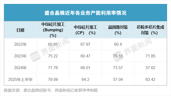 报告期内,盛合晶微的产能利用率不算饱和。2023年、2024年、2025年1-6月,其芯粒多芯片集成封装的产能利用率为71.85%、57.62%、63.42%。同时,2022年至2024年及2025年上半年(报告期内),该公司的中段硅片加工(Bumping)产能利用率分别为65.61%、75.22%、77.76%、79.09%,中段硅片加工(CP)分别为67.97%、60.47%、69.01%、64.2%,晶圆级封装业务的产能利用率分别是60.4%、76.55%、73.57%、57.04%。
