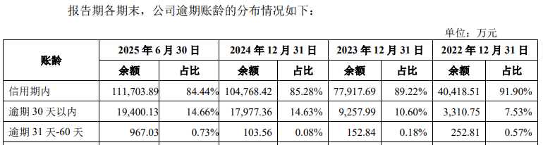 界面新闻了解到,该公司应收账款信用期主要为开票后30-60天。招股书显示,其报告期内逾期30天以内的应收账款分别是3310.75万、9257.99万、1.8亿、1.94亿元,占比分别是7.53%、10.6%、14.63%、14.66%。