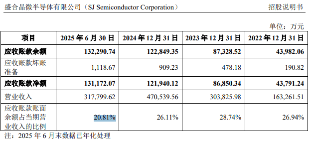同时,盛合晶微报告期内的应收账款账面余额分别为4.4亿、8.73亿、12.28亿和13.23亿元,占当期营收比例分别为26.94%、28.74%、26.11%和20.81%(2025年6月末数据已年化处理);同期的应收账款周转率分别为4.15、4.63、4.48和4.98,低于同行均值的7.53、7.07、6.69、6.34。