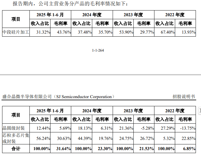 芯粒多芯片集成封装业务已成为盛合晶微的最主要收入来源。2023年、2024年及2025年前6月,该业务贡献收入分别是8604.34万元、7.45亿元、20.79亿元及17.82亿元,占比为5.32%、24.75%、44.39%、56.24%;该业务毛利率分别为22.85%、26.72%、19.76%、30.63%。