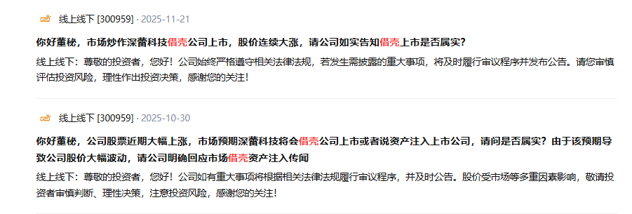 从深蕾科技开始筹划收购上市公司以来,市场上关于“借壳上市”的传闻不断。近期,有投资者在互动易平台提问,要求线上线下回应借壳传闻。线上线下表示,公司如有重大事项将根据相关法律法规履行审议程序,并及时公告。