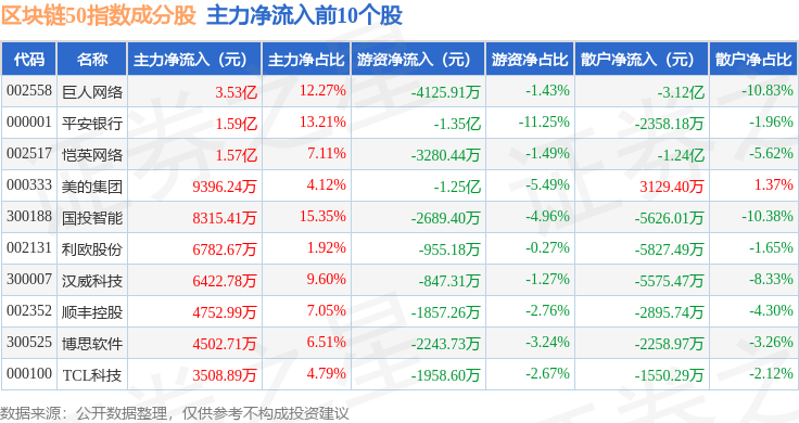 资金流向方面,区块链50(399286)指数成份股当日主力资金净流出合计9.03亿元,游资资金净流入合计1436.93万元,散户资金净流入合计8.89亿元。成份股资金流向详情见下表: