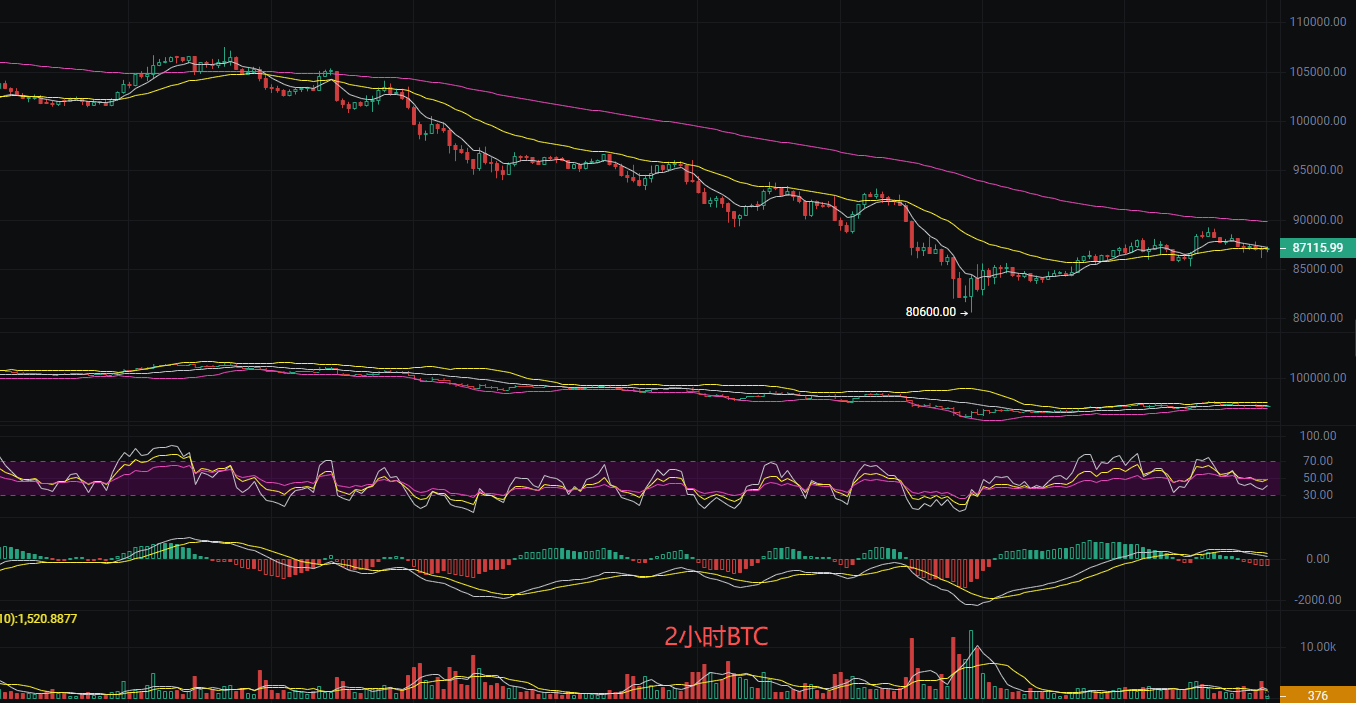 比特币现价87150,丽盈判断大饼当前BTC市场处于技术面和外部环境均无明确方向的状态。关键支撑位80600与阻力位88885之间,均线系统呈空头排列,但短期动能减弱且均线走平,暗示市场可能进入观察期。K线形态出现看涨吞没信号,表明短期内存在反弹可能,但未能形成趋势性确认。日线高位震荡回落多空双方存在一定分歧。2小时K线连续小幅下跌走势,整体偏弱,但未出现明显的单边趋势。MACD2小时短期内空头力量占优;但日线多头趋势尚未完全破坏,现在的盘口丽盈发现多空参半,大级别空短线多头,那么大概率就是走震荡行情,可以高抛低吸