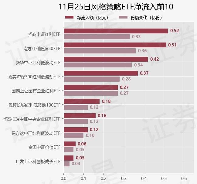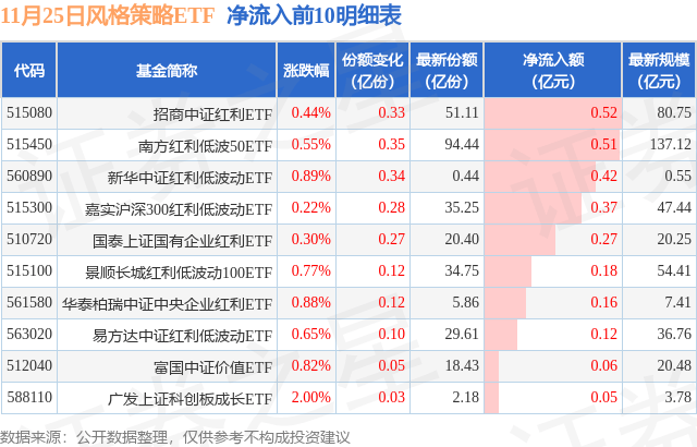 当日有11只风格策略ETF基金出现资金净流入,其中净流入排首位的是招商中证红利ETF(515080),份额增加了3300.0万份,净流入额为5211.79万元。