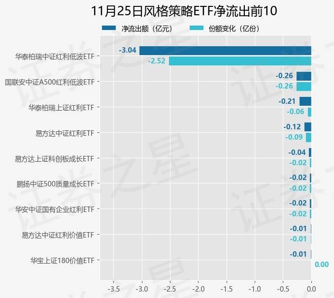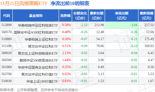 当日有9只风格策略ETF基金出现资金净流出,其中净流出排首位的是华泰柏瑞中证红利低波ETF(512890),份额减少了2.52亿份,净流出额为3.04亿元。