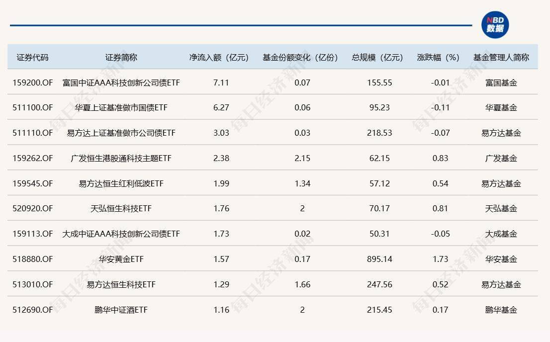 Wind数据显示,在11月25日的非货币ETF市场中,富国中证AAA科技创新公司债ETF基金份额增加0.07亿份,对应资金净流入7.11亿元;华夏上证基准做市国债ETF基金份额增加0.06亿份,实现净流入6.27亿元;易方达上证基准做市公司债ETF份额增加0.03亿份,带来净流入3.03亿元。