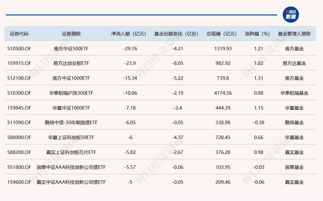 与此同时,南方中证500ETF基金份额减少4.21亿份,对应资金净流出29.76亿元;易方达创业板ETF份额减少8.05亿份,出现净流出23.90亿元;南方中证1000ETF份额减少5.22亿份,录得净流出15.34亿元。