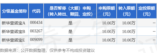 证券之星消息,11月26日新华基金管理股份有限公司发布《新华基金管理股份有限公司新华壹诺宝货币市场基金基金暂停(大额)申购(转换转入、赎回、转换转出、定期定额投资)公告》。公告中提示,为根据基金实际运作情况需要,为保证新华壹诺宝货币市场基金的稳定运作,保护基金份额持有人利益,以及根据《新华壹诺宝货币市场基金基金合同》的相关规定,新华基金管理股份有限公司决定于2025年11月26日起将新华壹诺宝货币市场基金原100万元的大额申购(含定期定额投资及转换转入)业务限制调整为10万元,自2025年11月26日起新华基金管理股份有限公司新华壹诺宝货币市场基金基金暂停(大额)申购(转换转入、赎回、转换转出、定期定额投资),申购、转换转入上限金额为10.0万元,下属分级基金调整明细如下:
