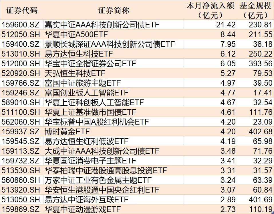 Wind数据显示,在12月3日的非货币ETF市场中,华夏中证A500ETF份额增加7.11亿份,实现净流入8.16亿元;嘉实中证AAA科技创新公司债ETF份额增加0.05亿份,对应净流入4.99亿元;易方达恒生科技ETF份额增加6.39亿份,带来净流入4.89亿元。
