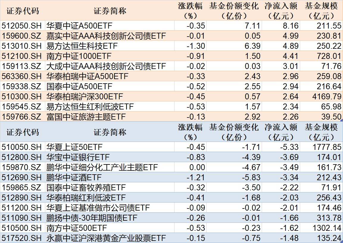 与此同时,华夏上证50ETF份额减少1.71亿份,对应净流出5.33亿元;华宝中证银行ETF份额减少4.39亿份,录得净流出3.69亿元;鹏华中证细分化工产业主题ETF份额减少4.67亿份,出现净流出3.49亿元。
