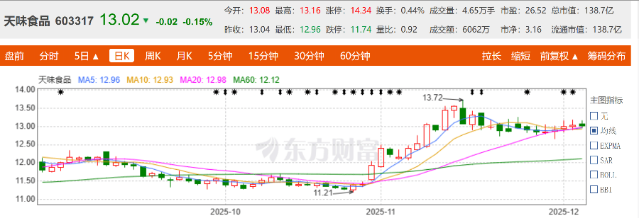 截止2025年12月3日,天味食品股价报收13.02元,下跌0.15%。《电鳗财经》将继续关注该公司赴港IPO的后续发展。