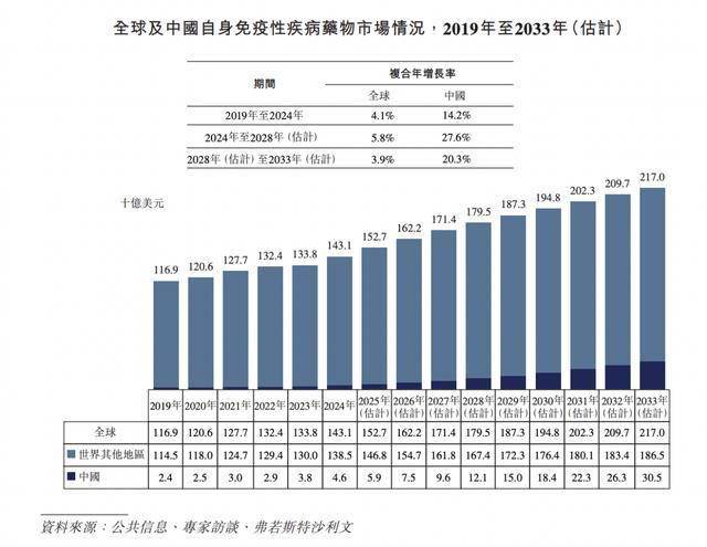 2019年至2024年期间,中国自身免疫性疾病药物市场规模从24亿美元增至46亿美元,复合年增长率为14.2%;预计到2028年将达到121亿美元,到2033年将达到305亿美元,2024年至2028年期间和2028年至2033年期间的复合年增长率分别为27.6%和20.3%。