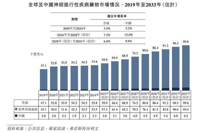2019年至2024年期间,全球神经退行性疾病药物市场规模从471亿美元增至558亿美元,复合年增长率为3.5%;预计到2028年将达到745亿美元,到2033年将达到998亿美元,2024年至2028年期间和2028年至2033年期间的复合年增长率分别为7.5%和6.0%。