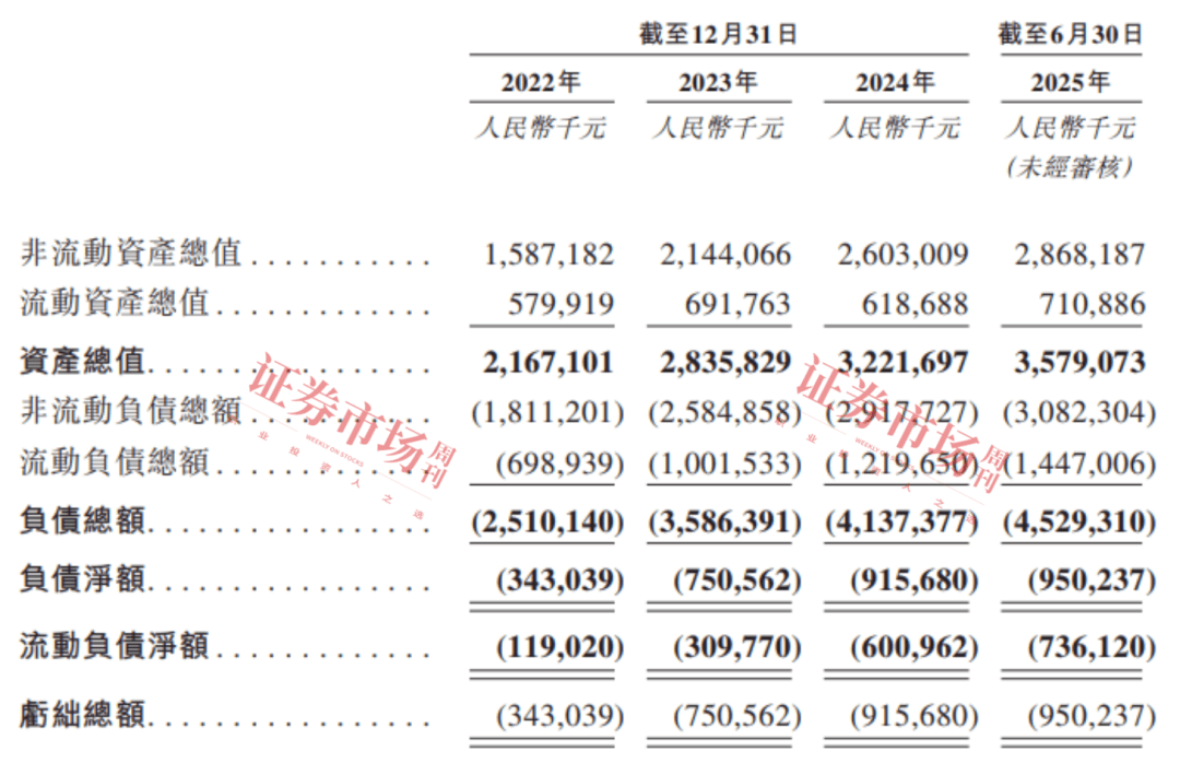 从资产状况来看, 截至报告期各期末,芯德半导体的资产总值分别为21.67亿元、28.36亿元、32.22亿元、35.79亿元,负债总额则分别达25.10亿元、35.86亿元、41.37亿元、45.29亿元,公司处于“资不抵债”的状态,负债净额分别为3.43亿元、7.51亿元、9.16亿元、9.50亿元。