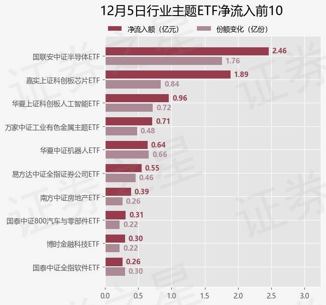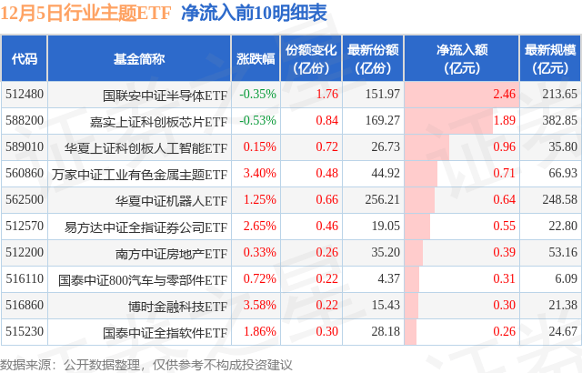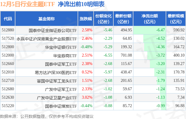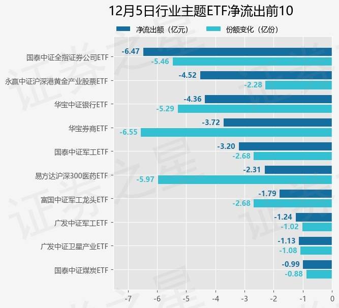 当日有118只行业主题ETF基金出现资金净流出,其中净流出排首位的是国泰中证全指证券公司ETF(512880),份额减少了5.46亿份,净流出额为6.47亿元。