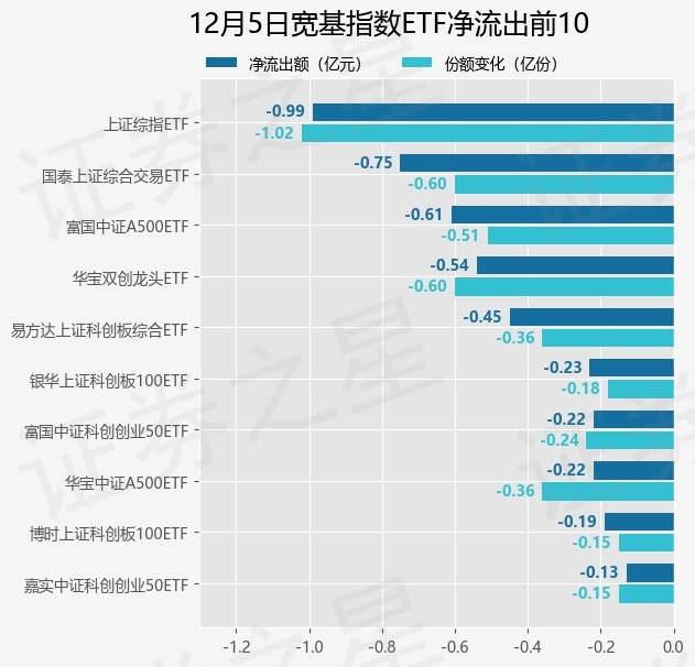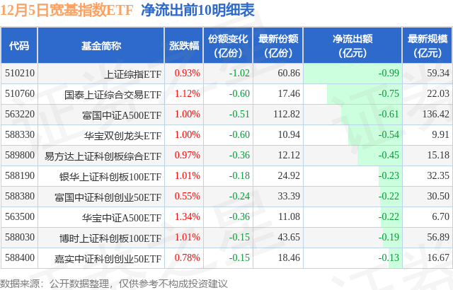 当日有54只宽基指数ETF基金出现资金净流出,其中净流出排首位的是上证综指ETF(510210),份额减少了1.02亿份,净流出额为9895.71万元。