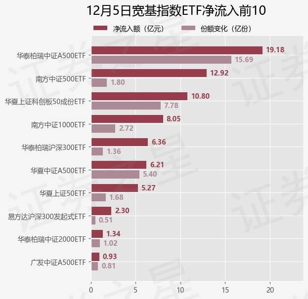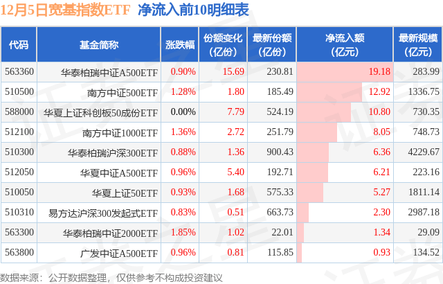 当日有52只宽基指数ETF基金出现资金净流入,其中净流入排首位的是华泰柏瑞中证A500ETF(563360),份额增加了15.69亿份,净流入额为19.18亿元。