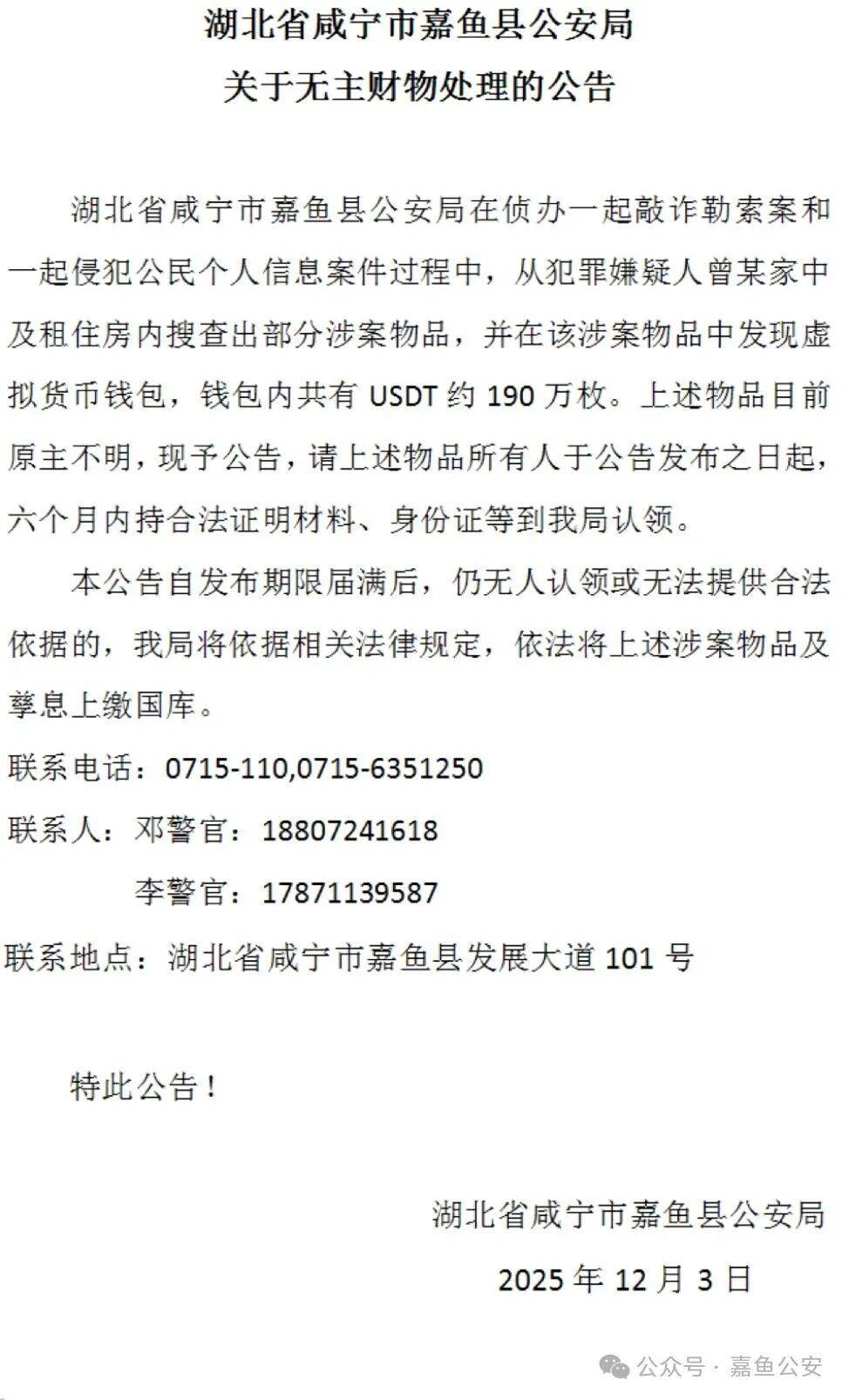 据湖北嘉鱼公安,12月5日,嘉鱼公安发布公告,寻找一笔涉敲诈勒索案的虚拟货币原主人,虚拟货币钱包内共有USDT币约190万枚。根据最新的市场汇算数据,大约价值1356.6万元人民币。