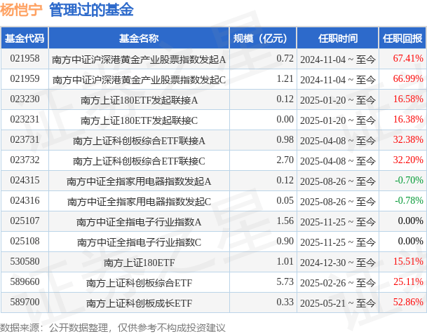 杨恺宁先生:约翰霍普金斯大学金融数学专业硕士,具有基金从业资格。2018年2月加入南方基金,任指数投资部研究员;2022年12月12日至2024年11月4日,任南方房地产ETF、南方创业板ETF、南方恒生香港上市生物科技ETF(QDII)基金经理助理;2023年10月23日至2024年11月4日,任南方中证通信服务ETF基金经理助理;2024年11月4日至今,任南方中证沪深港黄金产业股票指数发起基金经理;2024年12月30日至今,任南方上证180ETF基金经理;2025年1月20日至今,任南方上证180ETF发起联接(原:南方上证180指数发起)基金经理;2025年2月26日至今,任南方上证科创板综合ETF基金经理;2025年4月8日至今,任南方上证科创板综合ETF联接基金经理;2025年5月21日至今,任南方上证科创板成长ETF基金经理;2025年8月26日至今,任南方中证全指家用电器指数发起基金经理。