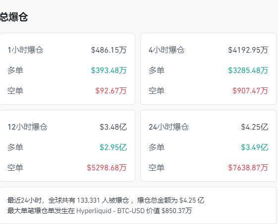 Coinglass数据显示,24小时,加密货币全网共有133381人被爆仓,爆仓总金额为4.25亿美元(约合人民币30亿元)。