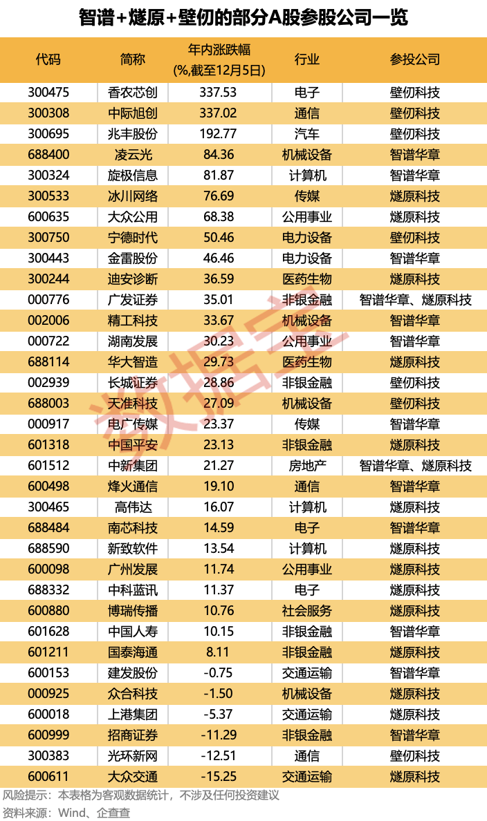 香农芯创、中际旭创、兆丰股份股价均实现翻倍,其中香农芯创、中际旭创年内涨幅均超过330%;3家公司均间接参投壁仞科技。