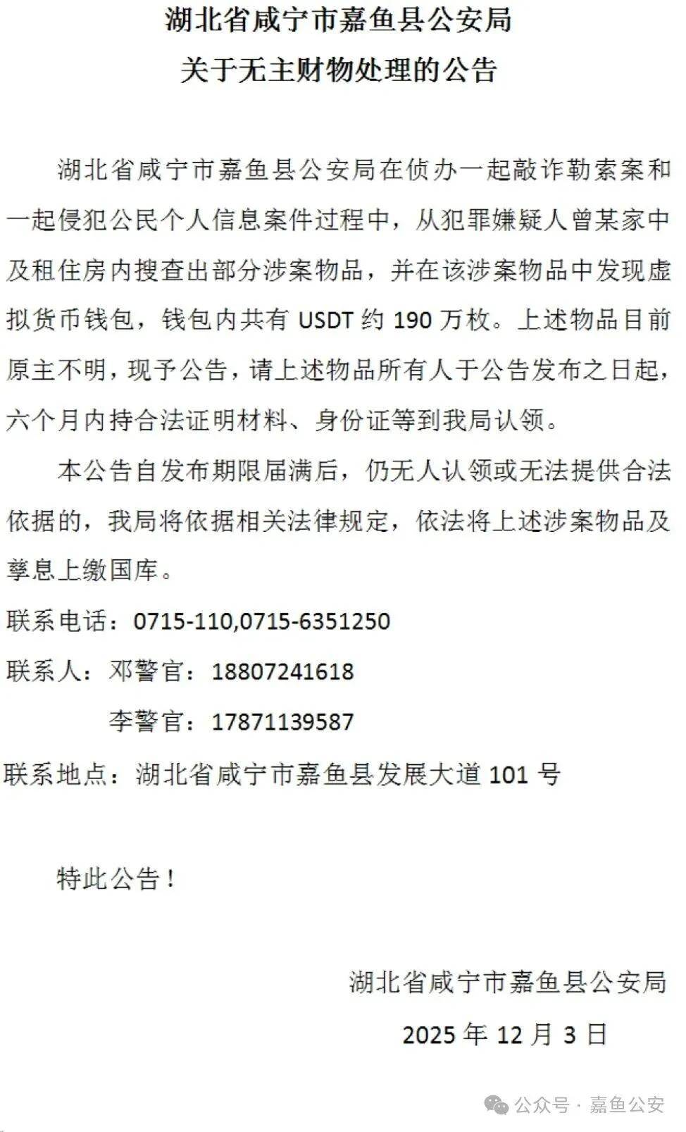 12月3日,湖北省咸宁市嘉鱼县公安局发布一则“关于无主财物处理的公告”称: