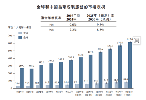 当前,绿色转型已成为包装产业的主旋律,循环包装更成为物流领域的核心增长点。弗若斯特沙利文数据显示,2024年中国循环包装服务市场规模达515亿元,占整体物流包装方案市场的6.4%,预计2030年将增至896亿元,2025至2030年复合年增长率达9.8%,为优乐赛提供了广阔的市场空间。